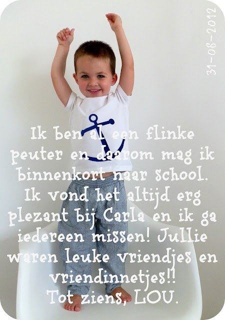 Morgen is Lou's laatste dagje bij de dagmoeder. Twee vriendinnetjes mogen ook naar de kleuterklas maar jammergenoeg gaan ze alle drie naar een verschillende school. Een echt afscheid dus en gezien Lou zich steeds met alle kindjes (zelfs met de baby's!) geamuseerd heeft vonden we een klein geschenkje wel op zijn plaats. Het werd voor elk een krijtbordje met krijtjes en een kaartje van Lou.